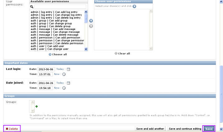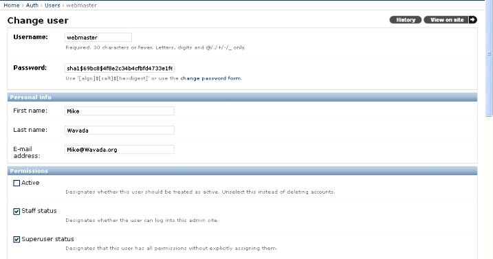 5. The Change user screen appears when you have added a user or selected an existing user to work on. It is rather long. Here is the top half: