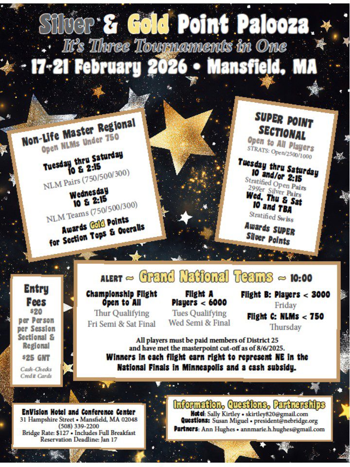 Wellsworth Hotel | Southbridge MA Tuesday, April 14 Events Open Pairs Gold Rush Pairs Open Swiss 199’er Pairs Super Point Pairs Series (1 of 3) Who Can Play Everyone Players under 750 Everyone Newer players Everyone Strats Open / 3000 / 1250 750 / 500 / 300 Open / 3000 / 1500 200 / 50 ... Read more