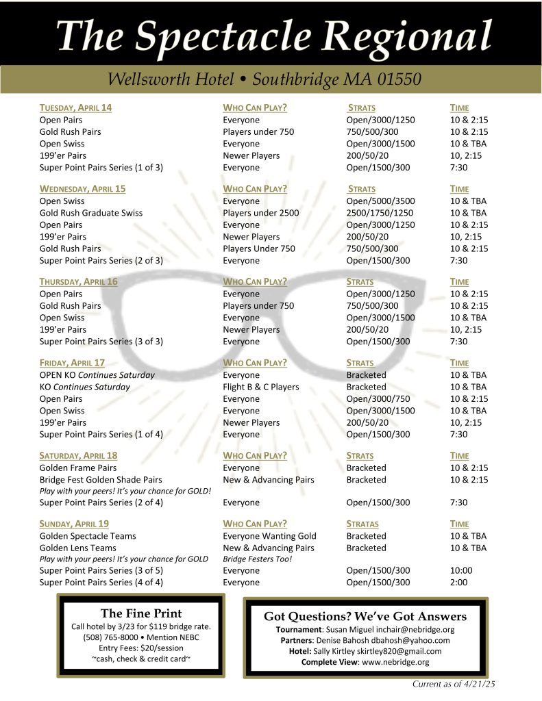 The New England Bridge Conference (NEBC) is home to thousands of bridge players across the six New England states. As District 25 of the American Contract Bridge League, we bring together more than 7,000 members in eight local units, offering tournaments, club games, and learning opportunities for players of every level.